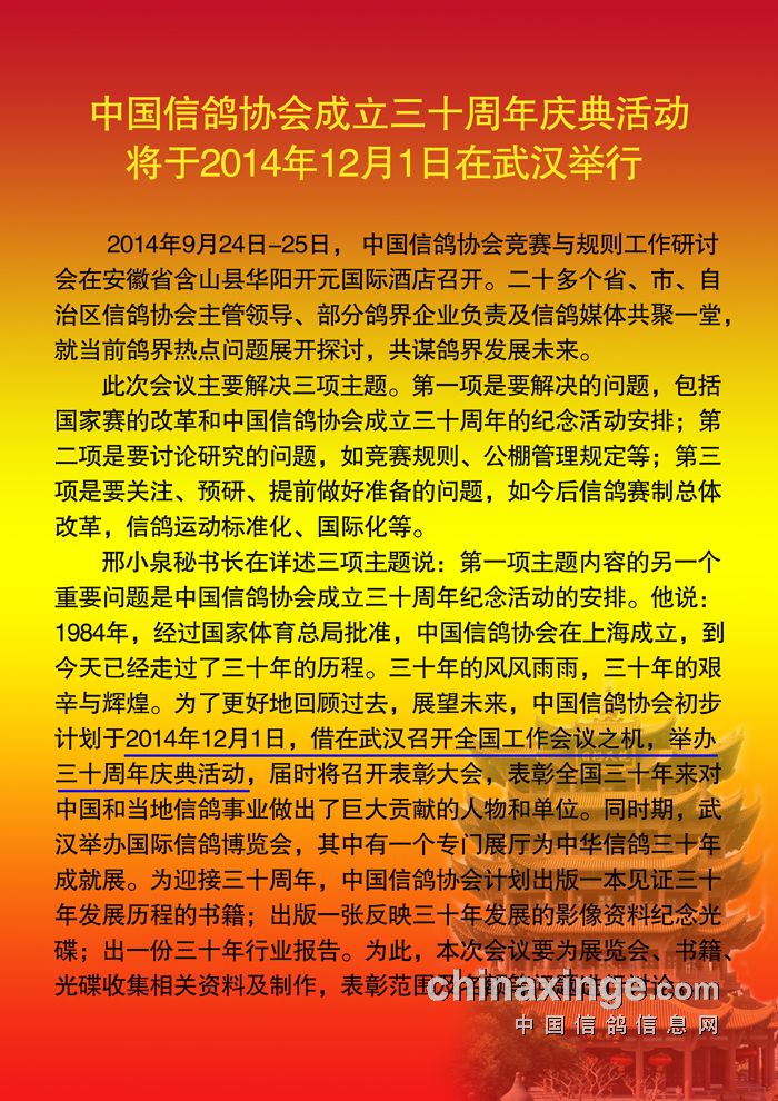 中鸽协成立30周年庆典活动将于中国武汉鸽展同时举行