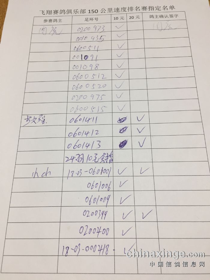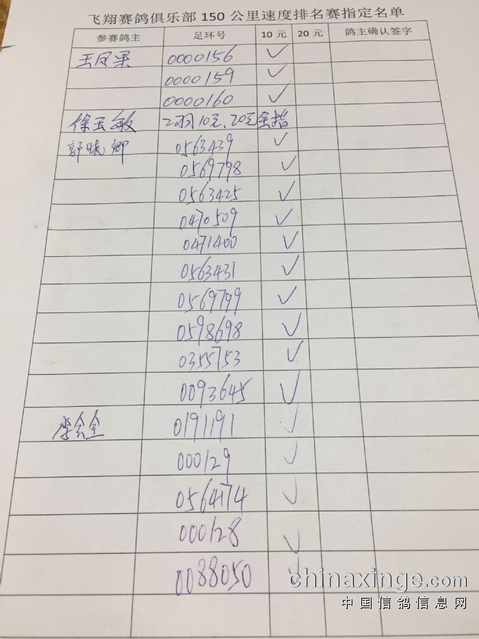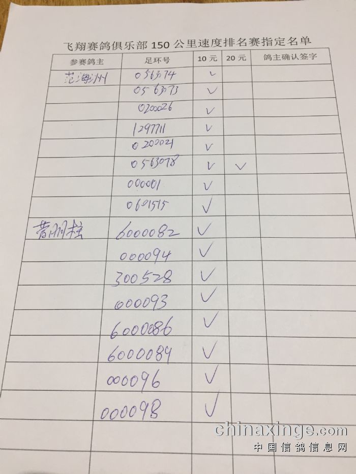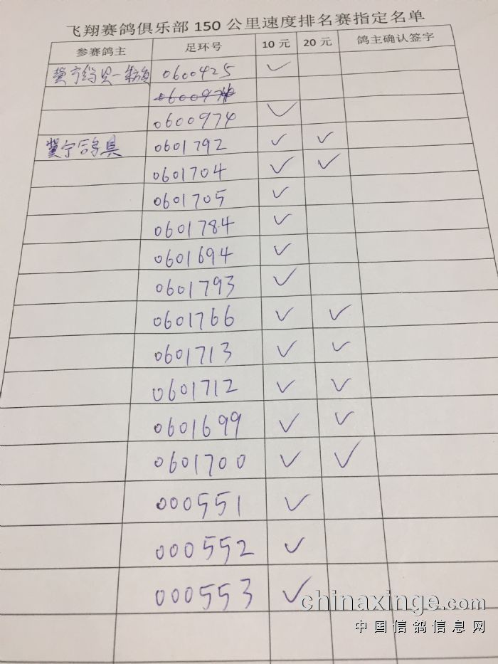 河北宁晋飞翔赛鸽俱乐部150公里速度排名指定名单