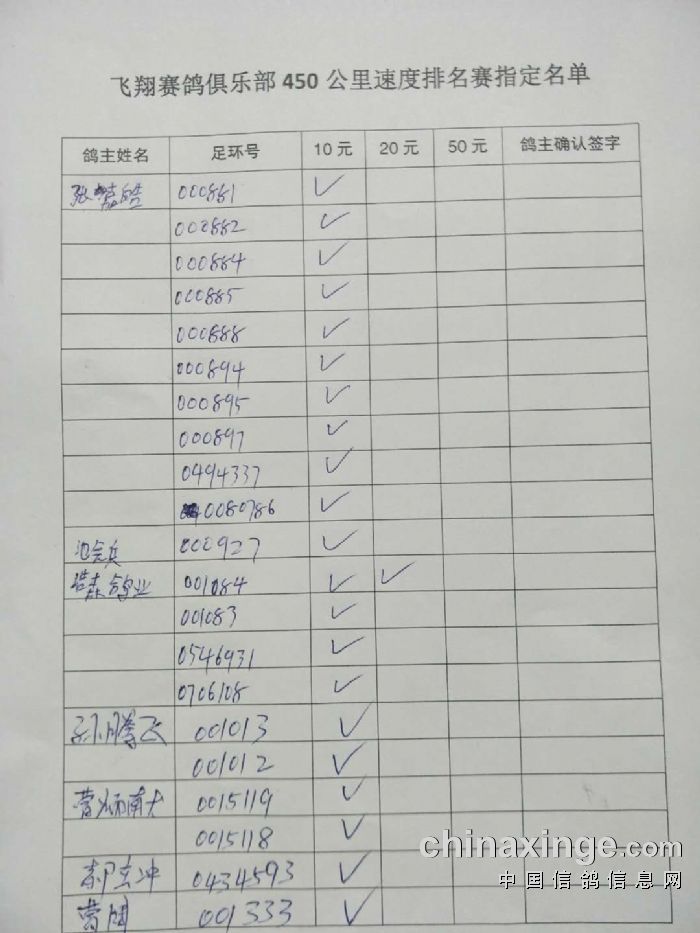 河北宁晋飞翔赛鸽俱乐部第一关450公里指定名单