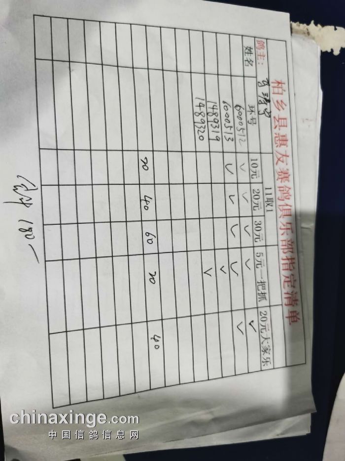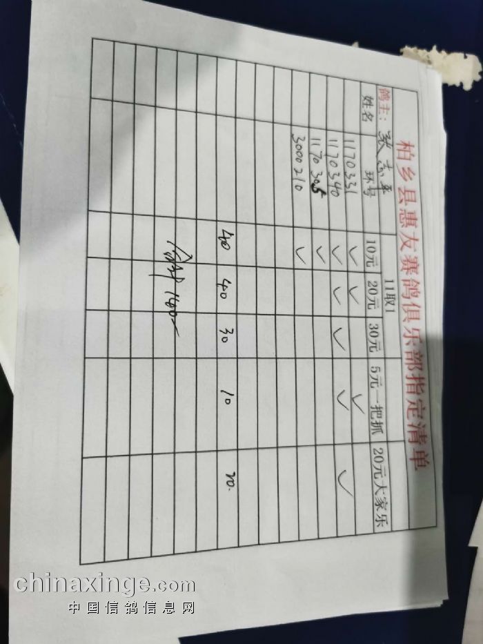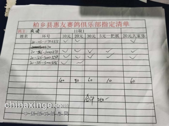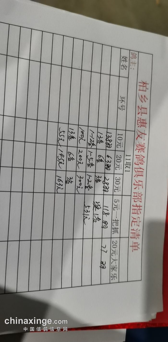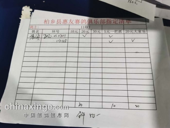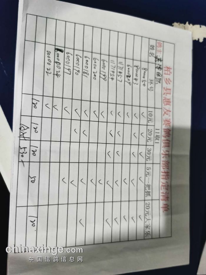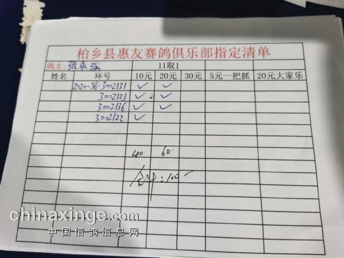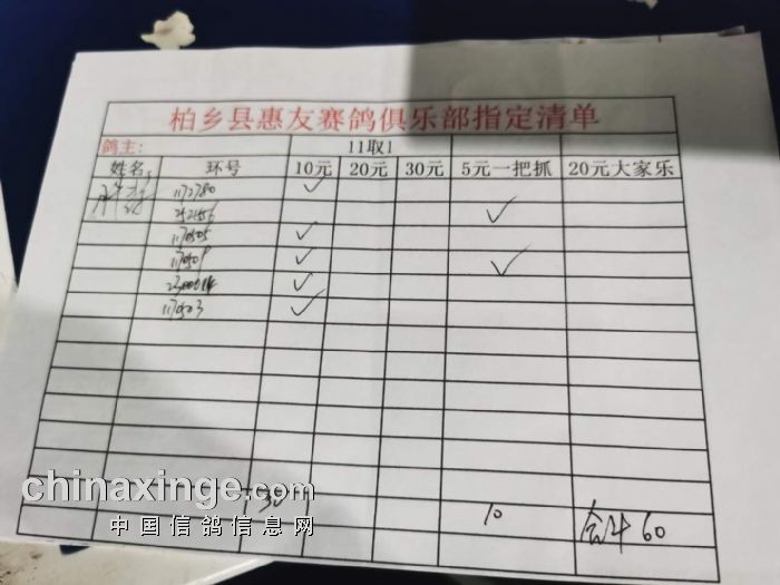 2020年秋柏乡县惠友赛鸽俱乐部150公里测试赛指定名单及分配