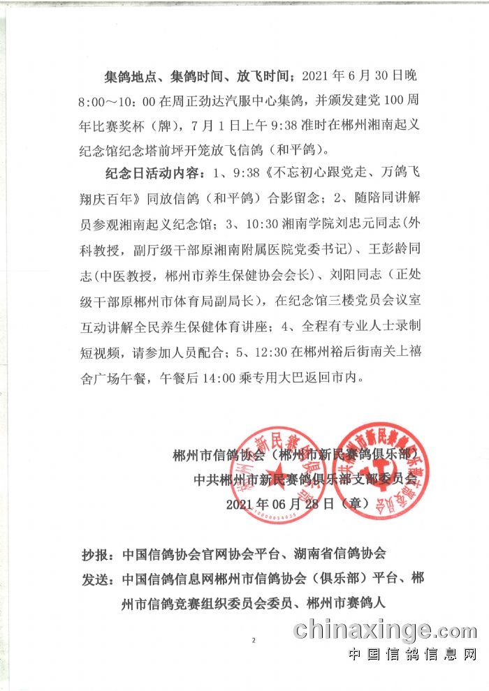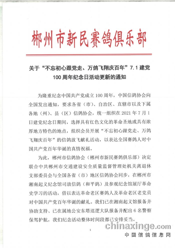 关于“不忘初心跟党走、万鸽飞翔庆百年”7.1建党100周年纪念日活动更新安排的通知