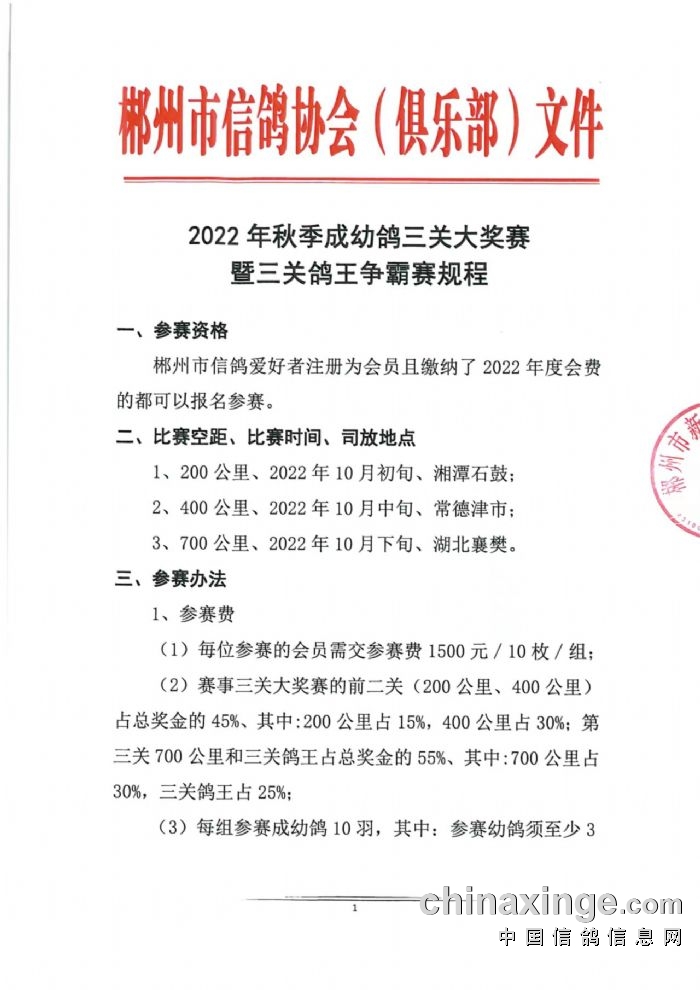 2022年秋季成幼鸽三关大奖赛暨三关鸽王争霸赛规程