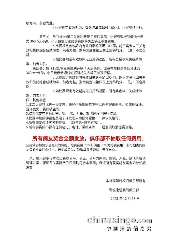 郓城唐塔赛鸽俱乐部特比超出原计划售环