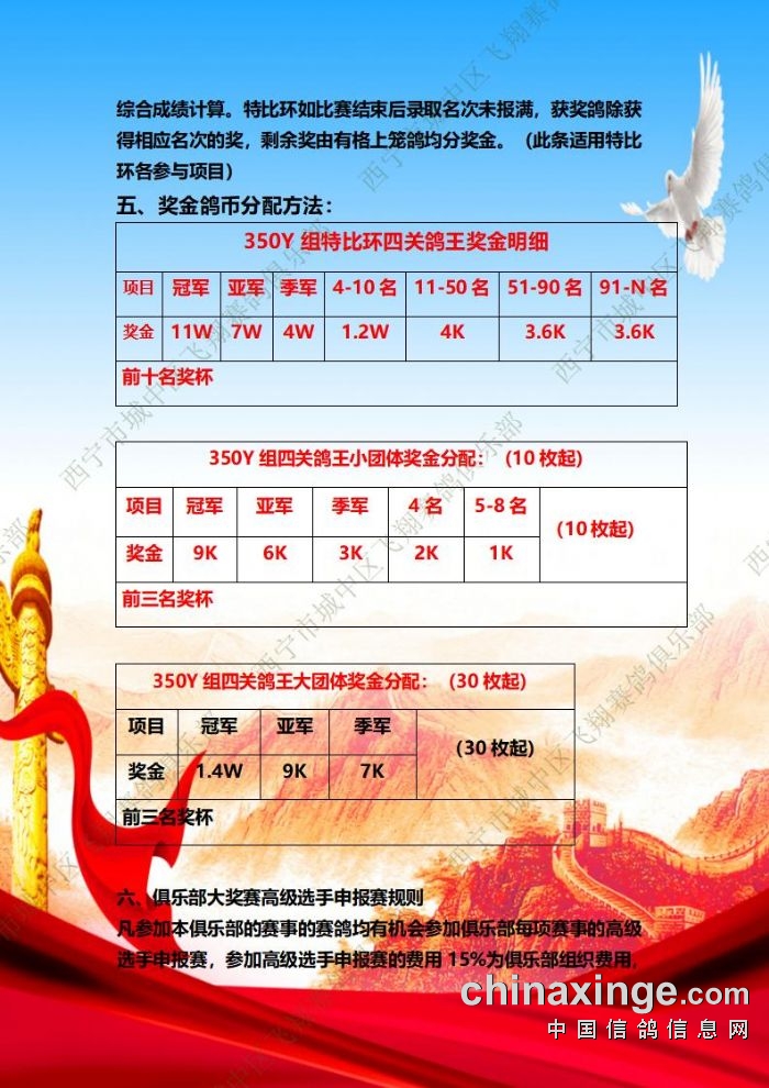 2024年秋季飞翔四关特比环四关鸽王养训聚宝技能赛A、B组、养训技能大师运输工具挑战赛申报奖金分配