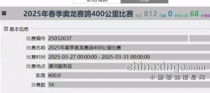 2025年春季奥龙赛鸽400公里比赛共计集鸽812羽,取300名,预祝大家取得好成绩。