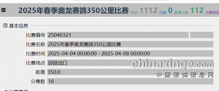 2025年春季奥龙赛鸽350公里比赛-集鸽数据