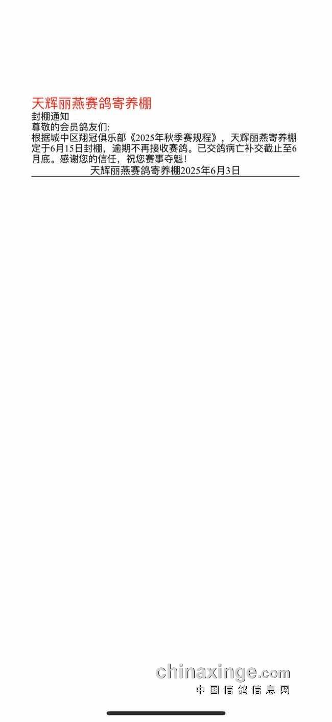 天辉丽燕赛鸽寄养棚缴费探视通知