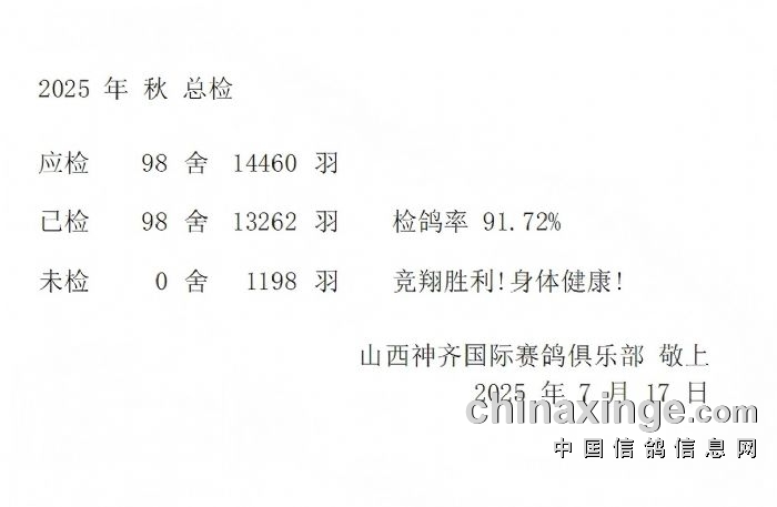 山西神齐国际赛鸽俱乐部总检工作于7月17日下午日落圆满结束。