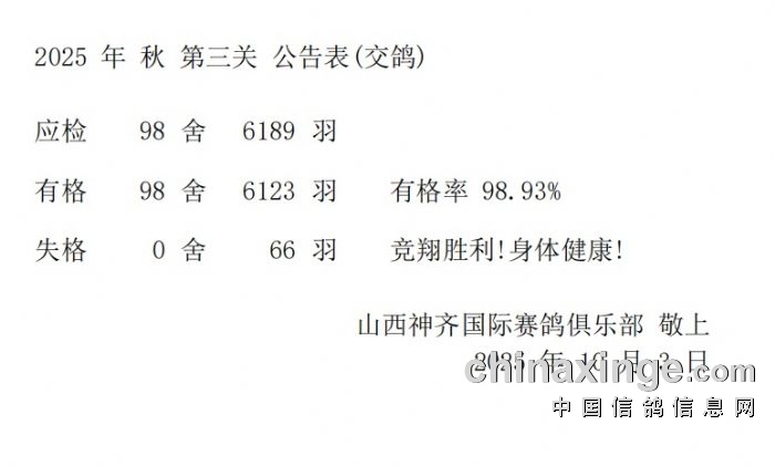 2025年职业信鸽联赛山西神齐站第三关集鸽工作于10月3日下午圆满完成。此次集鸽工作由朔州市信鸽协会、怀仁市信鸽协会、俱乐部全体工作人员共同完成。共有98舍6123羽有格参赛鸽。最后在监赛裁判和参赛鸽友的共同见证下,对2025年第三关比赛专用暗章进行了当众销毁。