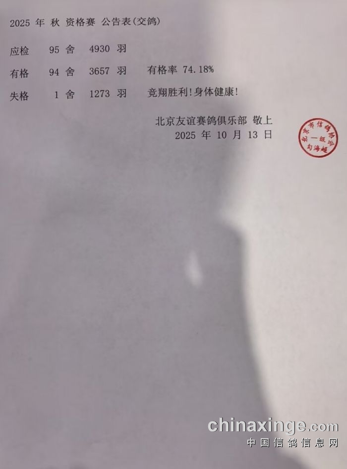 2025年“友谊杯”四关鸽王挑战赛资格赛集鸽工作于2025年10月13日进行,在北京市信鸽协会裁判监督下集鸽工作顺利圆满完成,本次共集鸽94舍3657羽。放飞车队于20点25分出发。