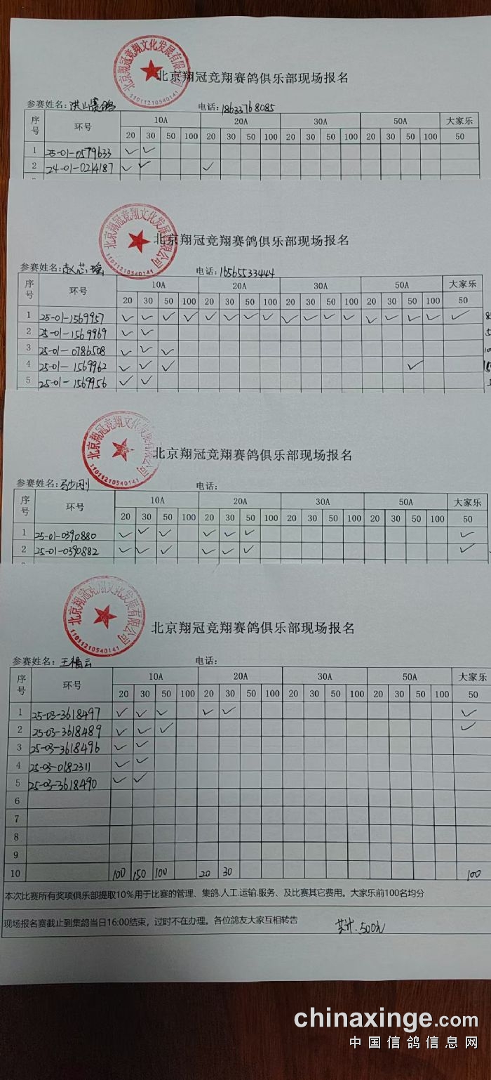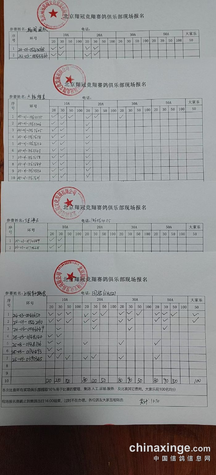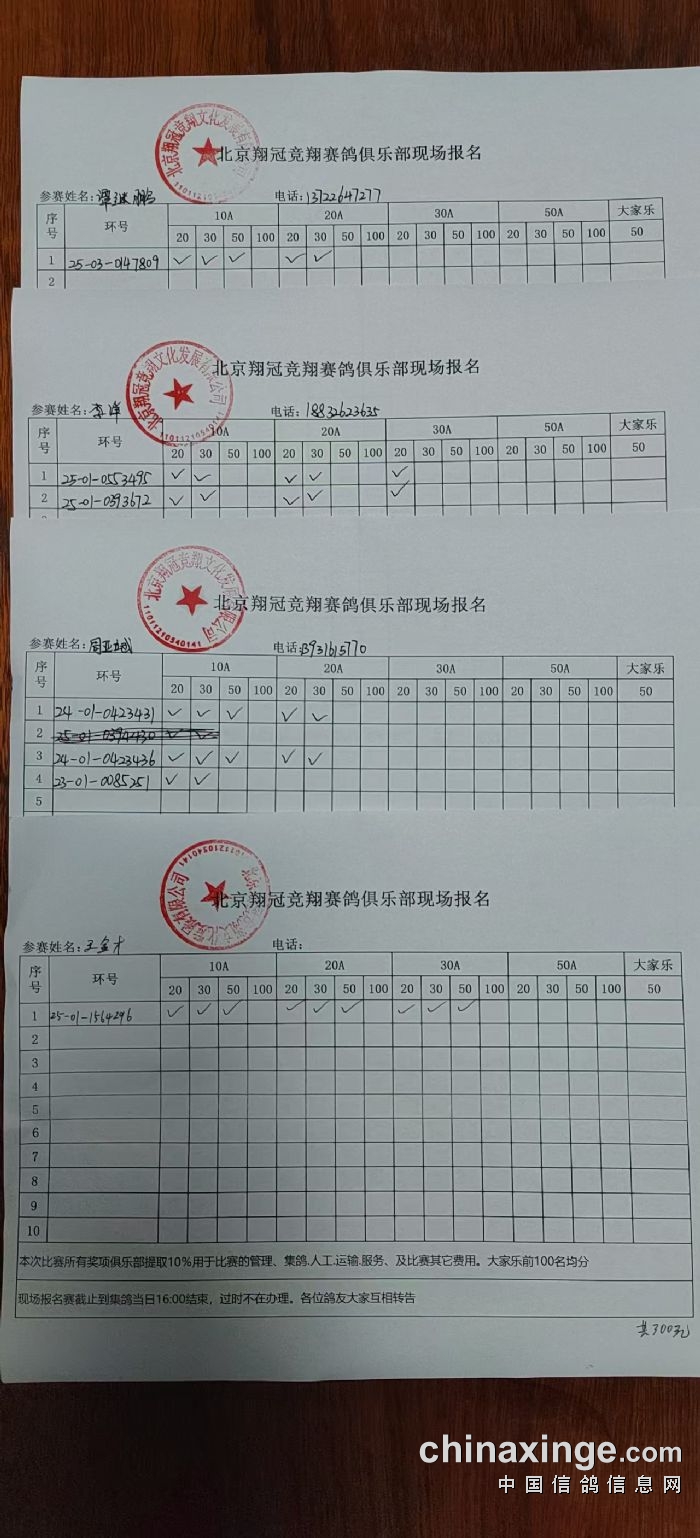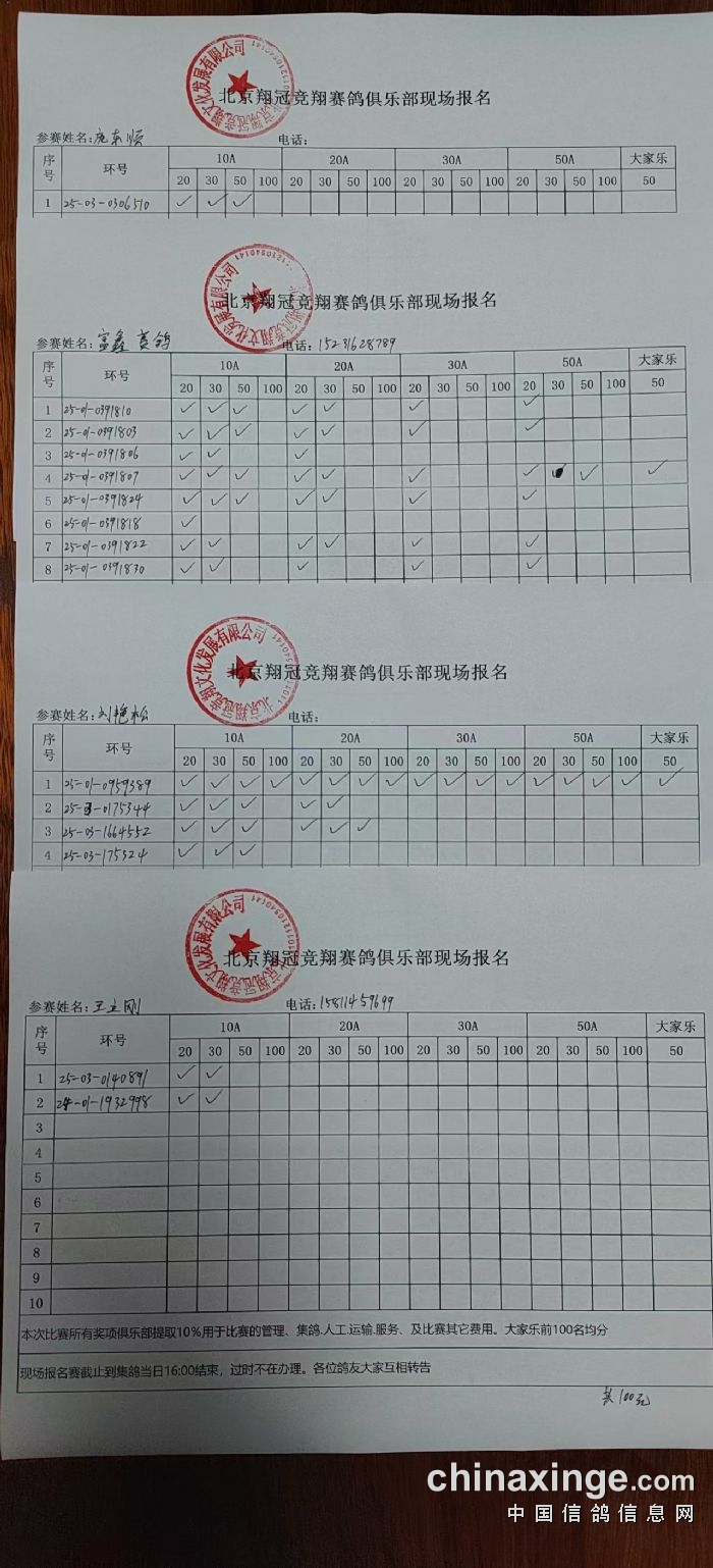 北京翔冠赛鸽俱乐部310公里比赛现场报名单