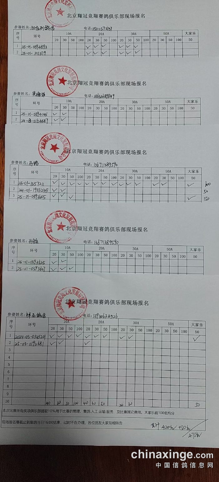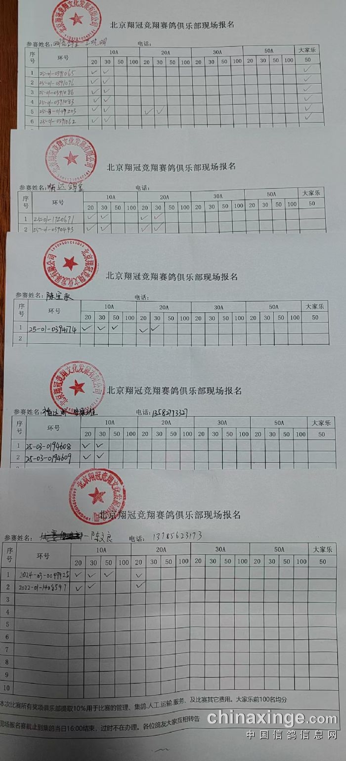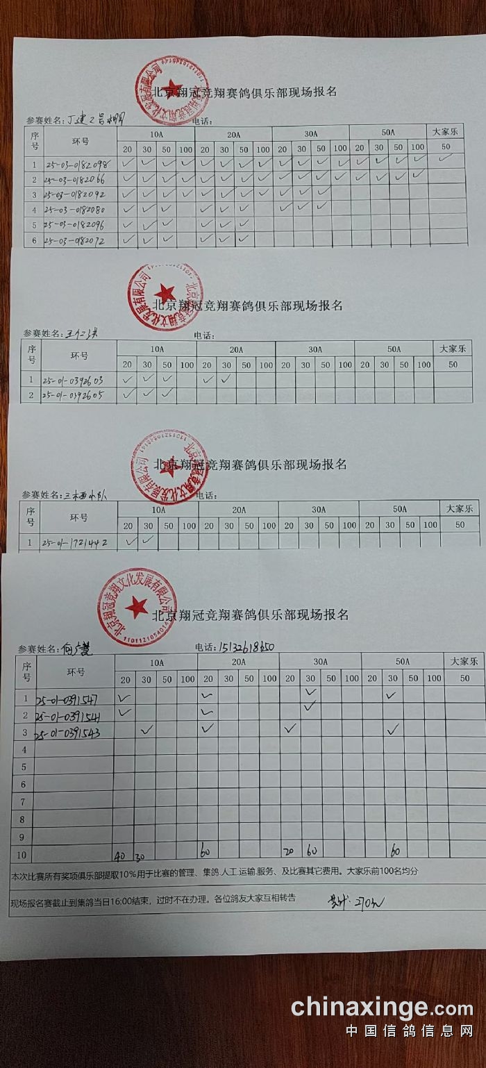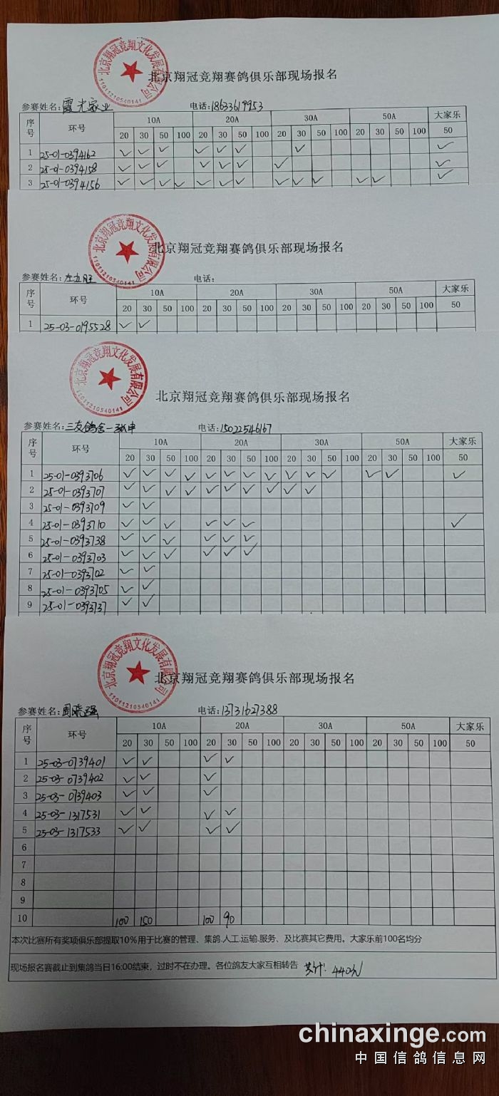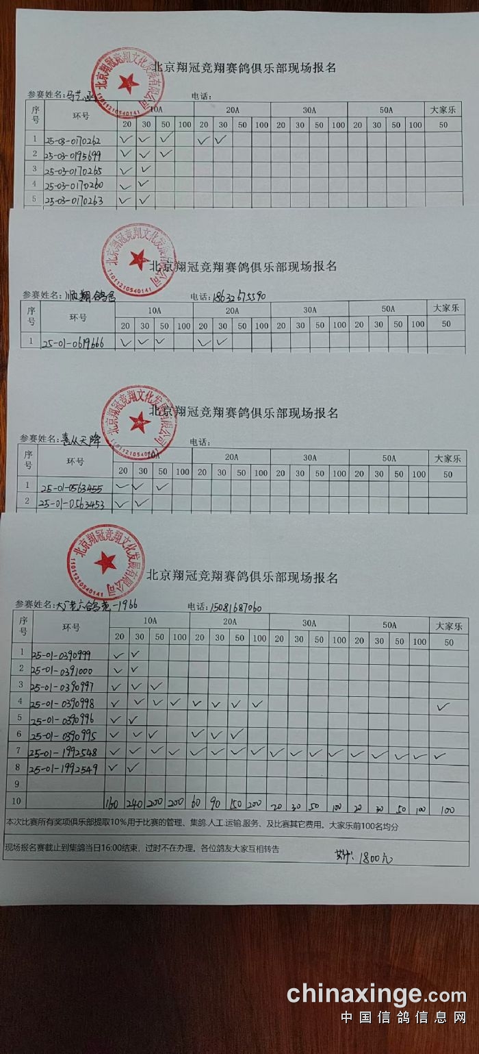 北京翔冠赛鸽俱乐部310公里比赛现场报名单