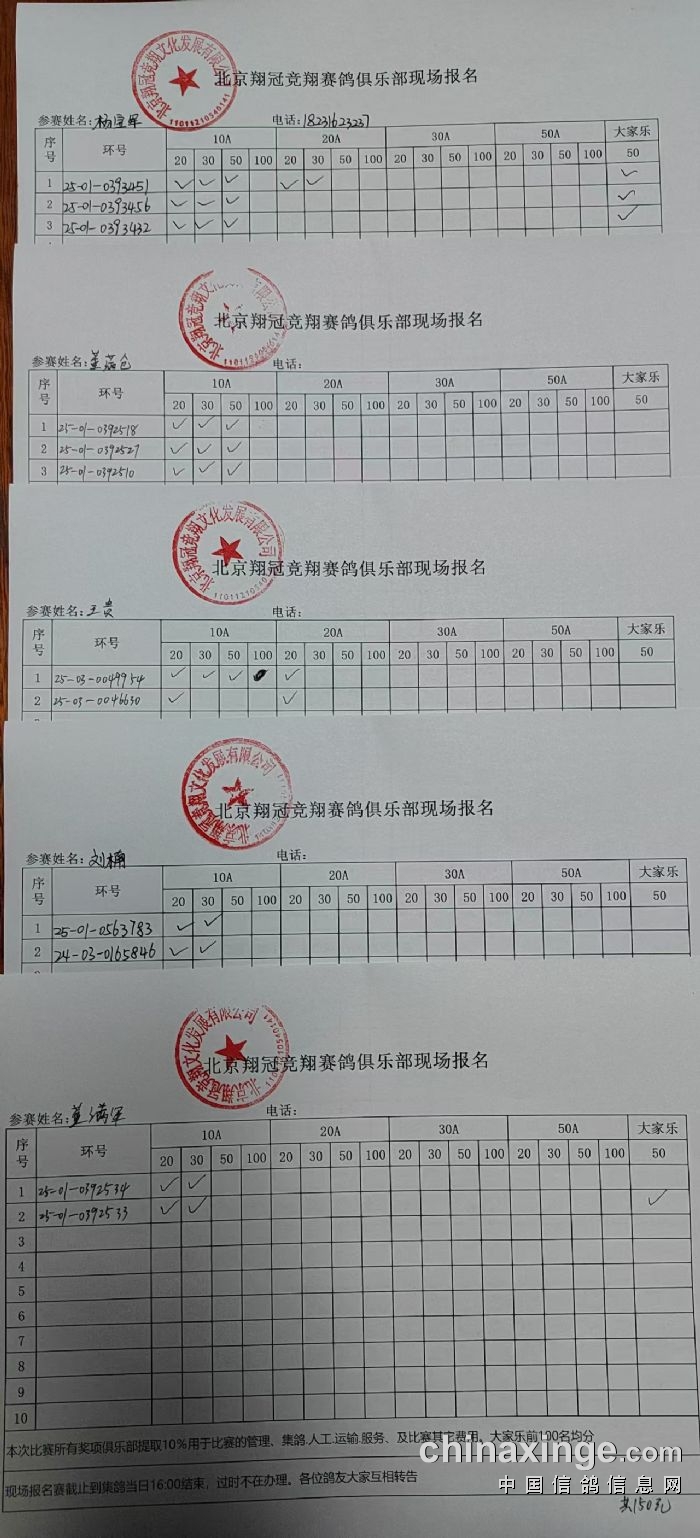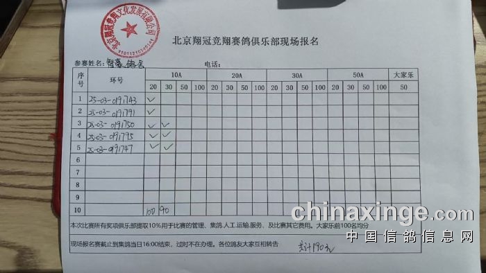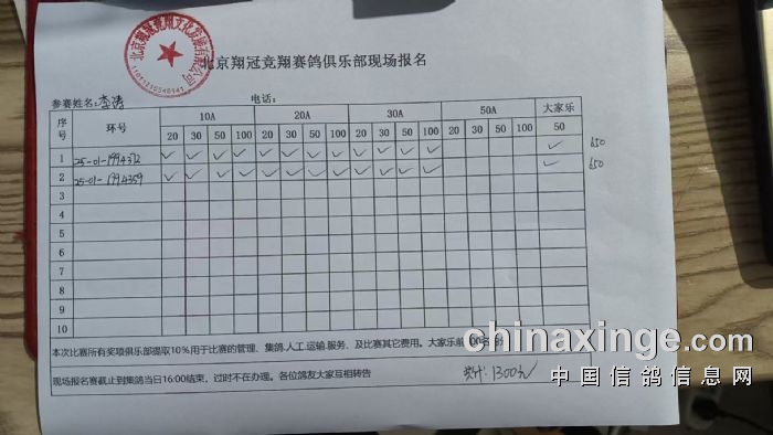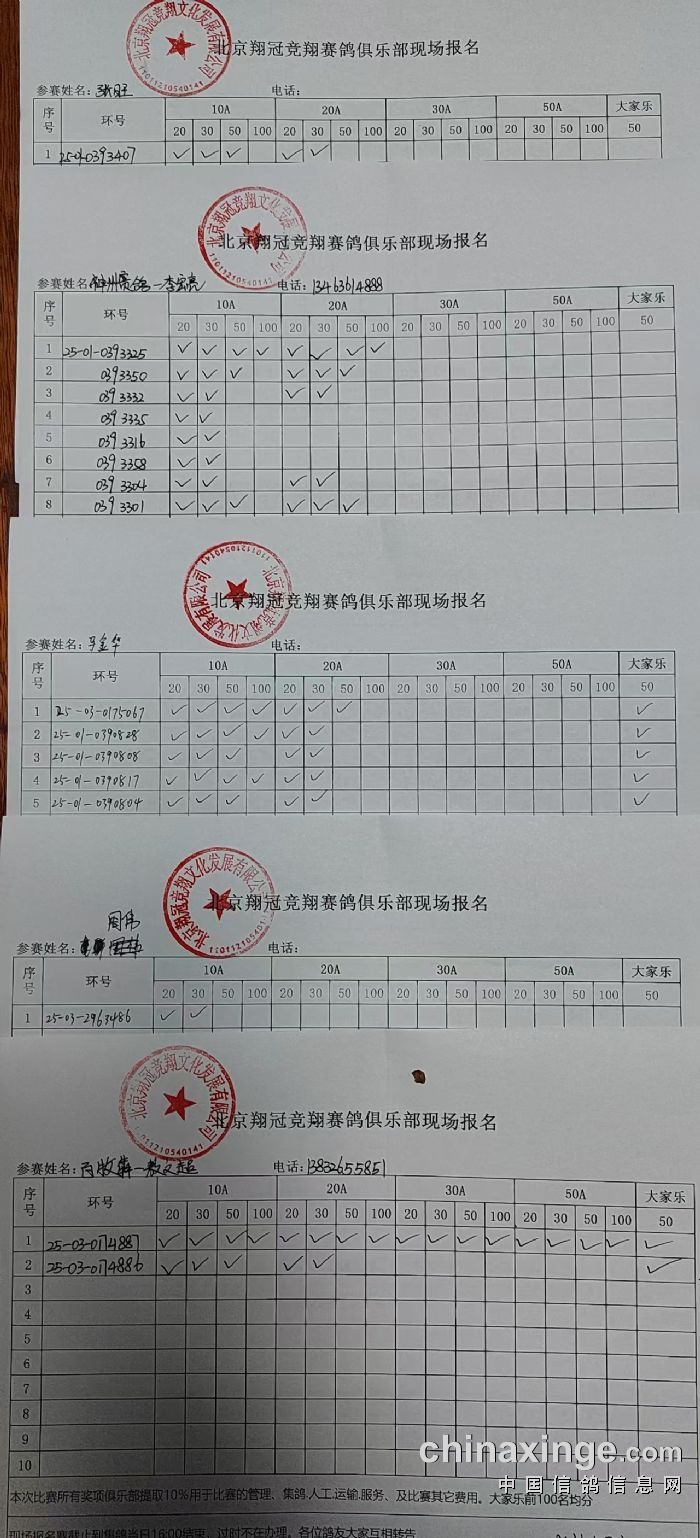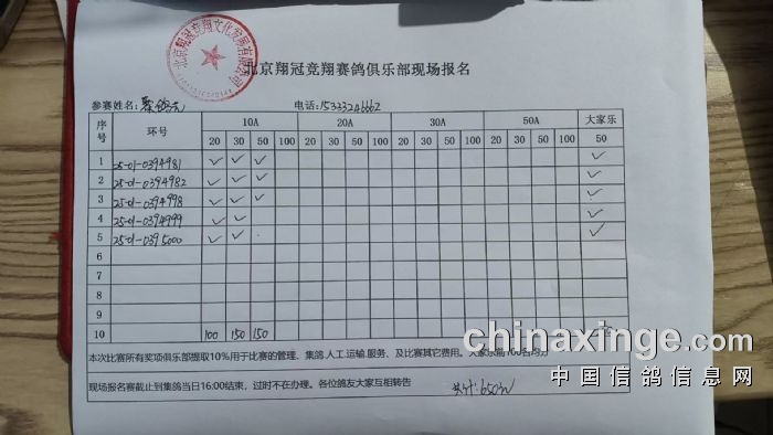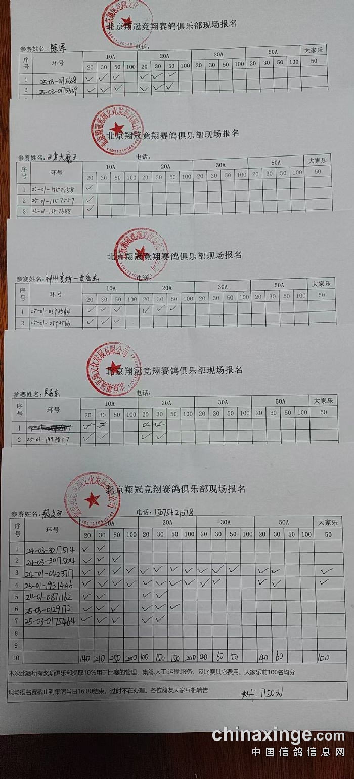 北京翔冠赛鸽俱乐部310公里比赛现场报名单