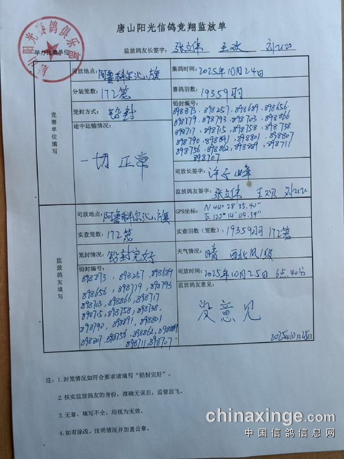 2025秋季唐山市信鸽协会&唐山阳光五关联翔赛第四关(巴林左旗) 铅封鸽笼销毁暗章