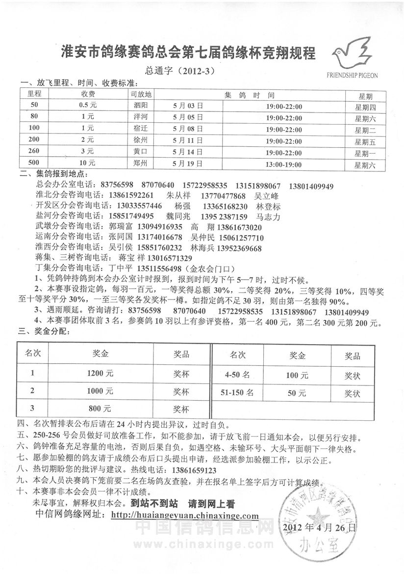 淮安市鸽缘赛鸽总会第七届鸽缘杯竞翔规程